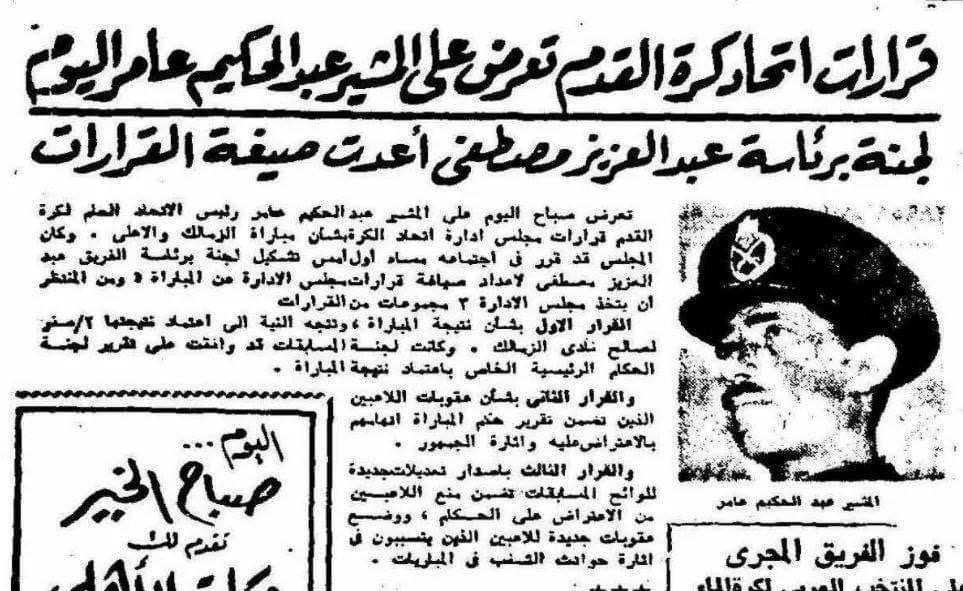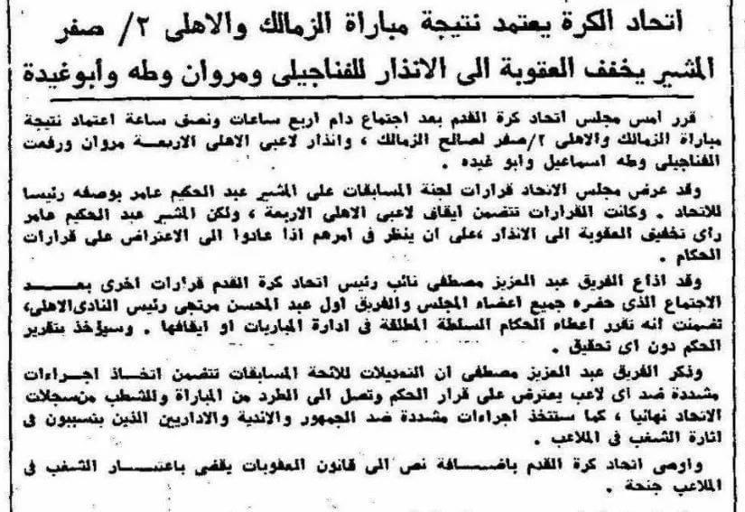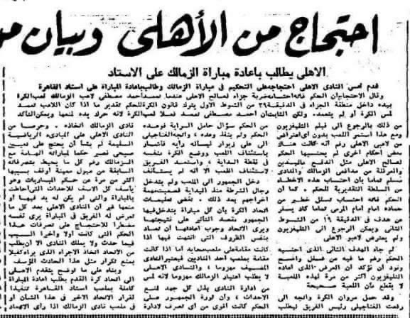 فضيحة صبحى نصير.. الموضوع طويل رغم اختصاره. بلا خجل.. اختار اتحاد الكرة برئاسة عبد الحكيم عامر (نائب رئيس الجمهورية) صبحى نصير لادارة مباراة الزمالك والاهلى. القرار اغضب ادارة الاهلى وطالبت سرا بتغييره بأى حكم أخر ولكن اتحاد الكرة صمم على نصير صاحب فضيحة الغاء هدف المحلة فى الزمالك. كشف نصير عن وجهه القبيح مبكرا.. وبعد تقدم الزمالك بهدف هاجم الاهلى واضطر احمد مصطفى مدافع الزمالك لابعاد تمريرة الفناجيلي الى طه اسماعيل المنفرد بيده.. ضربة جزاء مليون بالمائة.. ولكنه أشار بسير اللعب.. وتكررت مخالفات لاعبي الزمالك داخل منطقة جزائهم من دفع وجذب لايقاف هجمات الاهلى دون اى حزم او قرارات من الحكم. وفى بداية الشوط الثانى والأهلى الأكثر هجوما ترك الحكم حماده امام المتسلل جدا واشار باستمرار اللعب ولولا براعة مروان لعزز الزمالك تقدمه بهدف من تسلل.. وفى منتصف الشوط ارتدت الكرة سريعا لينفرد عمر النور المتسلل أيضا بالمرمى ولكنه سجل هدفا هذه المرة.. واعترض رفعت الفناجيلي وزملاؤه على الهدف لتسلل عمر.. وطلب الفناجيلي من الحكم الذهاب الى حامل الراية لسؤاله بعد ان اشار بالتسلل ورفع رايته لكن صبحى رفض الذهاب وتمسك بصحة الهدف مؤكدا أن حامل الراية لم يرفع رايته بالتسلل.. ورفض الفناجيلي وزملاؤه استئناف اللعب واضطر مدير الكرة على زيوار الى النزول الى الملعب ووضع الكرة بنفسه على نقطة الوسط لتنفيذ ركلة البداية واستعد لاعبو الاهلى الغاضبون لاستئناف اللعب.. ولكن جماهير الأهلى اقتحمت الملعب للاعتداء على الحكم ودخلت الشرطة لحمايته.. وتدفقت الجماهير وهرب اللاعبون وتطايرت الحجارة والكراسي وأشتعلت النيران فى المدرجات ليتحول الأمر الى شغب واسع.. وقرر الحكم انهاء اللقاء. ونقدم لكم الوثائق التالية مع الموضوع: أولا: الاهرام نجيب المستكاوى يشير الى امرين خطأ تعيين صبحى نصير وانه استفزاز للاهلى ومجاملة للزمالك. وجود ركلة جزاء صحيحة للاهلى من لمسة يد احمد مصطفى. ثانيا: احتجاج الاهلى على النتيجة واشارته لركلة الجزاء وتغاضي الحكم عن حقوق الاهلى.. وعن عنف لاعبي الزمالك وعن تسلل حماده ثم عن تسلل عمر النور فى الهدف الثاني. ثالثا: تصريحات على زيوار مدير الكرة فى الاهلى حول الهدف التسلل وركلة الجزاء التى اغفلها الحكم. رابعا: اجتماع مجلس ادارة اتحاد الكرة وبه ثلاثة من رموز الزمالك حسن عامر رئيس النادى ومحمد لطيف ومحمود امام.. وهو الاتحاد الذى قرر تعيين صبحى نصير ثم اعتماد النتيجة. خامسا: بيان مرتجى وحسن عامر رئيسي الاهلى والزمالك.. أى ان رئيس الزمالك عضو باتحاد الكرة الذى يرأسه أخوه المشير. سادسا: عبد الحكيم عامر رئيس اتحاد الكرة ونائب رئيس الجمهورية يعتمد قرارات الاتحاد (اتحاد الذى يديره اخوه) ويخفف عقوبة لاعبي الاهلى من الايقاف للانذار. هتافات مكثفة: البلد اهلاوية (طبعا عبد الحكيم عامر اهلاوى) الحكام اهلاوية (طبعا صبحى نصير اهلاوى) اتحاد الكرة (طبعا حسن عامر ومحمد لطيف ومحمود امام اهلاوية)
